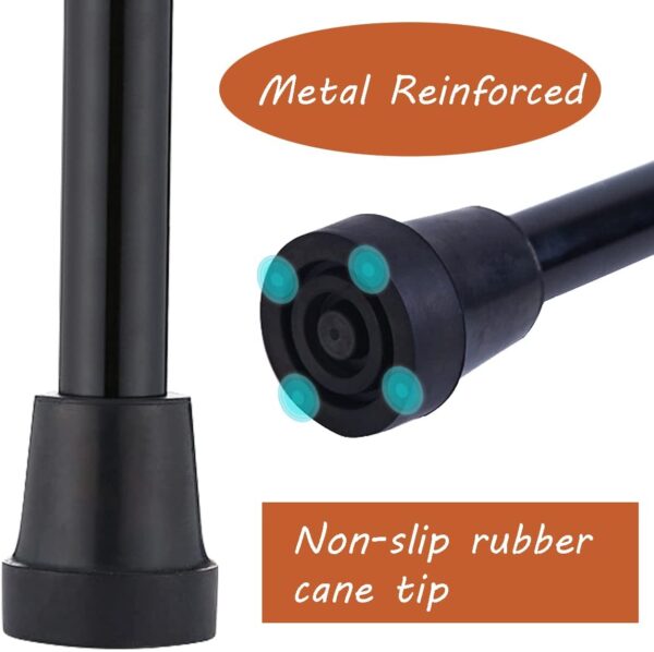 SLIP-RESISTANT RUBBER TIP: Collapsible cane is designed with a rubber tip at the bottom with some traction for additional stability so that the cane does not slip in if you are on wet pavement.. The walking cane is compatible with most replacement tips, such as tripod tips, quad tips and ice tips.(Fit 3/4 inch shaft cane tip)