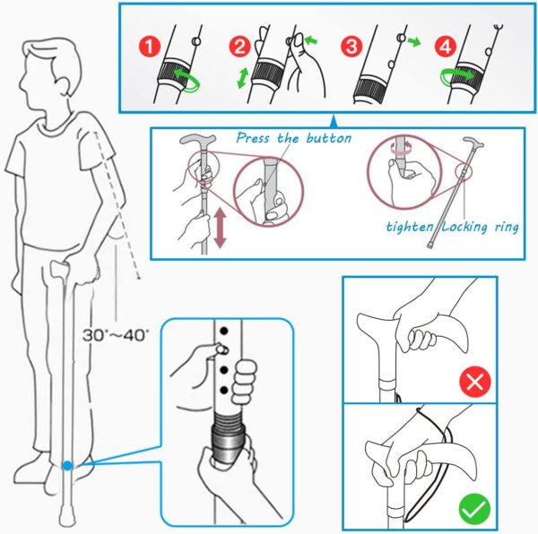 ADJUSTABLE AND COMFORTABLE: There are 5 additional length adjustment holes,5 levels adjustable height from 33 inch to 37 inch in 1 inch increment,providing a convenient option for those needing assistance of a cane.Comfortable contoured handle has an ergonomic design to fit the shape of the palm and relieve pressure from wrist.